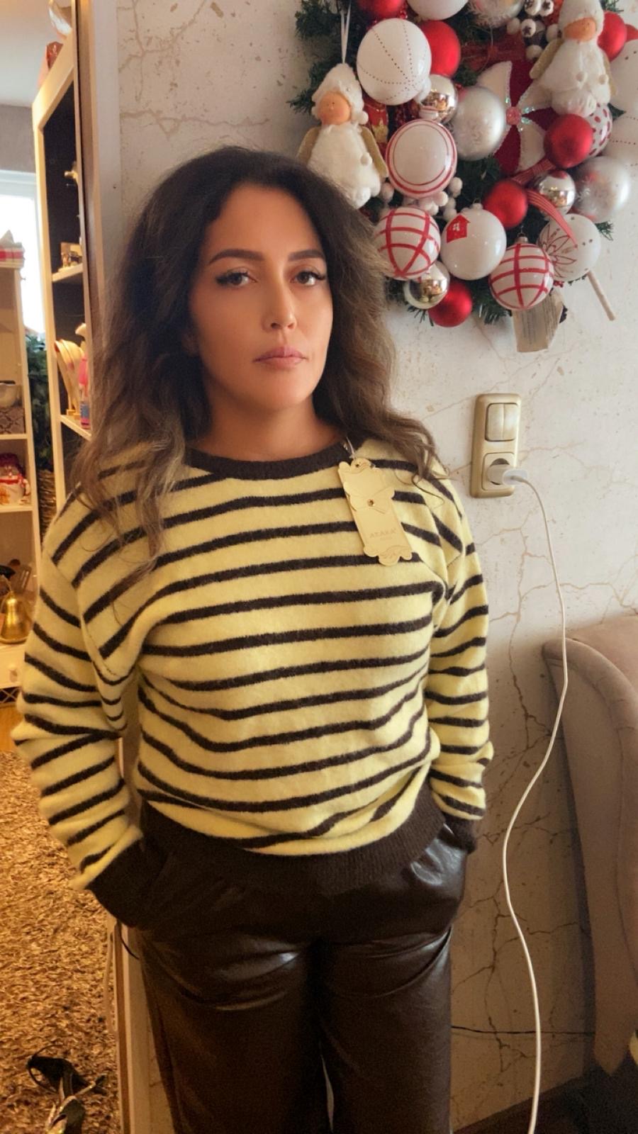 Bruin-geel gestreepte trui met een strik op de rug. Draagbaar tot maat L.